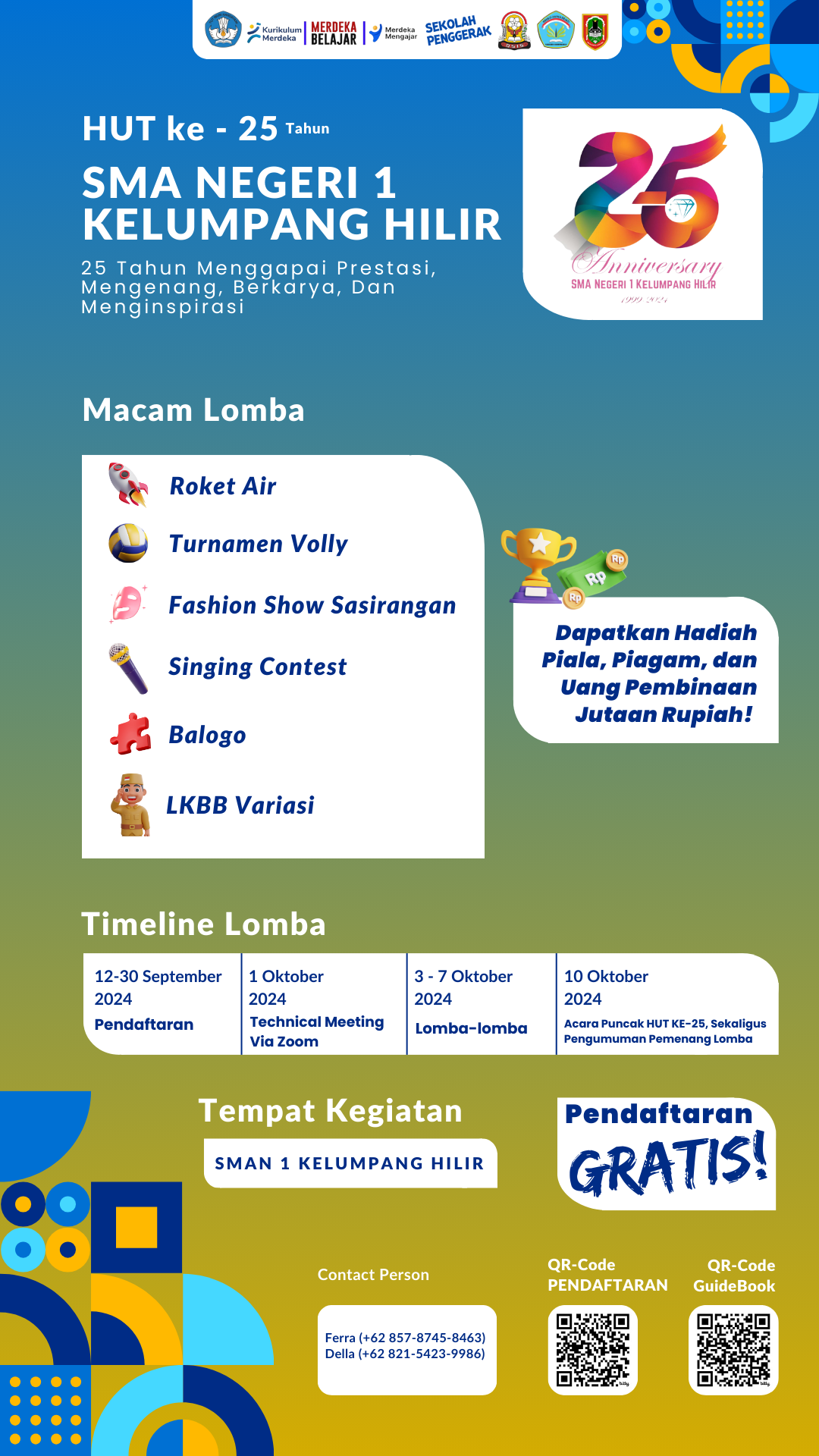 Jangan lewatkan kesempatan berharga ini! Dapatkan pengalaman tak terlupakan, perkuat persahabatan antar sekolah, dan raih penghargaan yang disediakan untuk para juara!